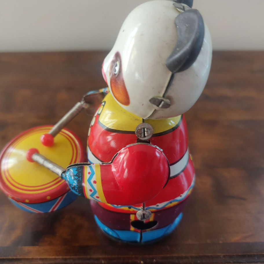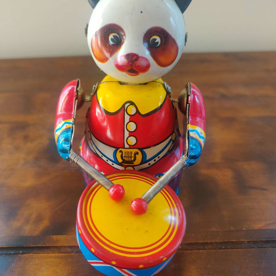 Really lovely, clockwork panda drummer. They have a happy face and all working correctly. The panda comes with key and an excellent condition box. Vintage made in China 10 cm tall by 6 cm wide
