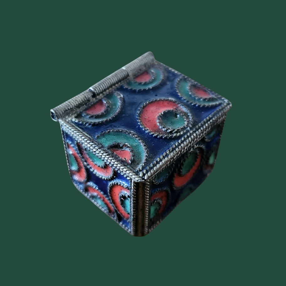 This style of colourful enamel decoration is associated with Persian, Indian, and Central Asian craftsmanship, where such small boxes were often made as betel nut containers, pill holders, or travel keepsakes. The size makes it perfect as a collector’s cabinet piece, yet practical enough to be used for keeping tablets or treasured small items.
