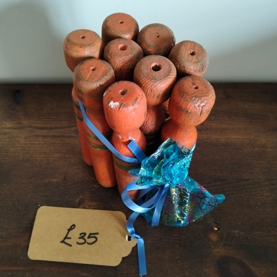 This skittles set makes a wonderful decorative accent for a vintage-inspired games room, cottage interior, or nostalgic display. It also appeals to collectors of antique toys, pub games, and handmade wooden items.