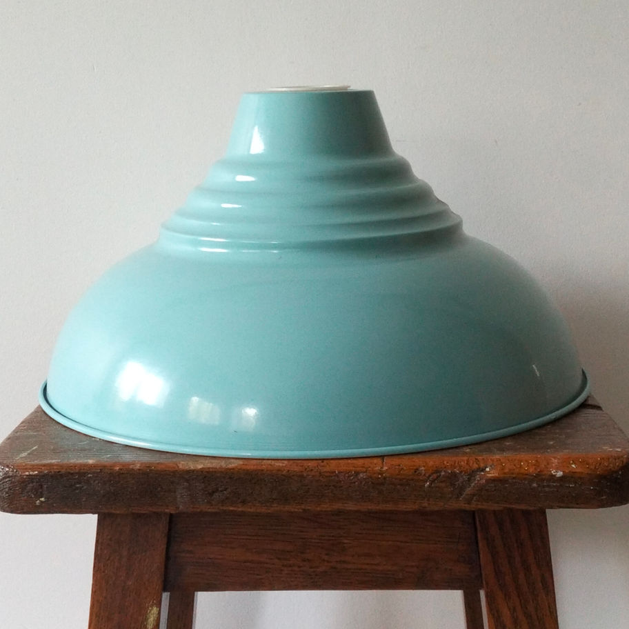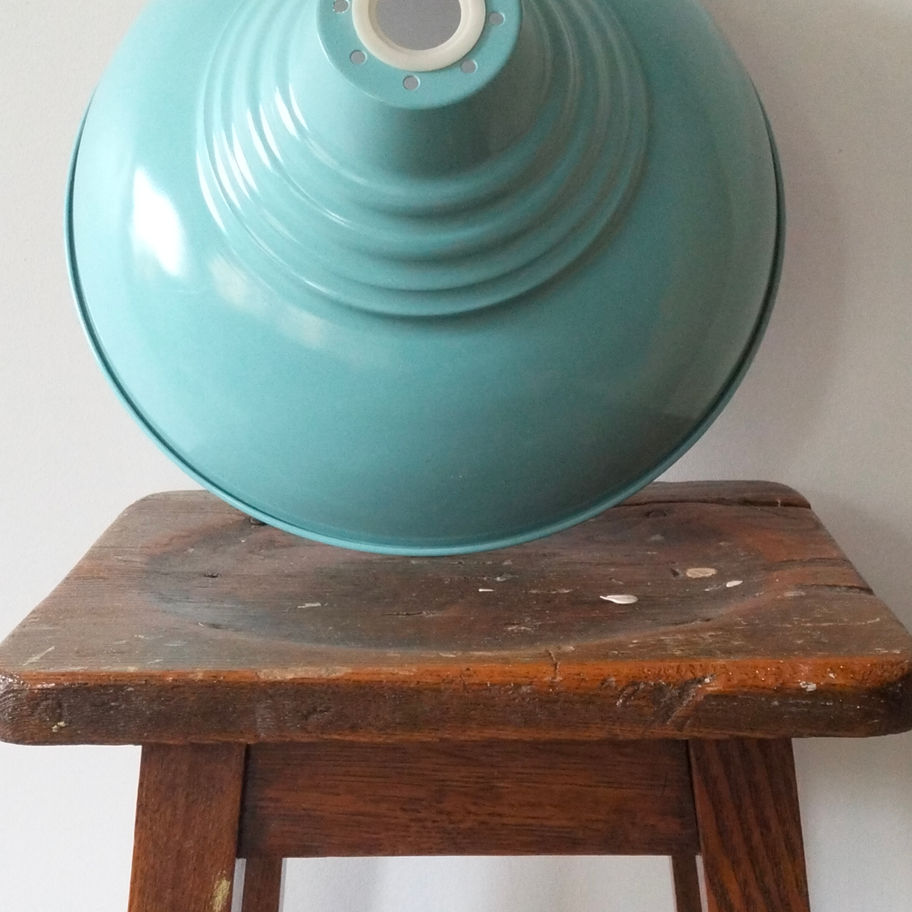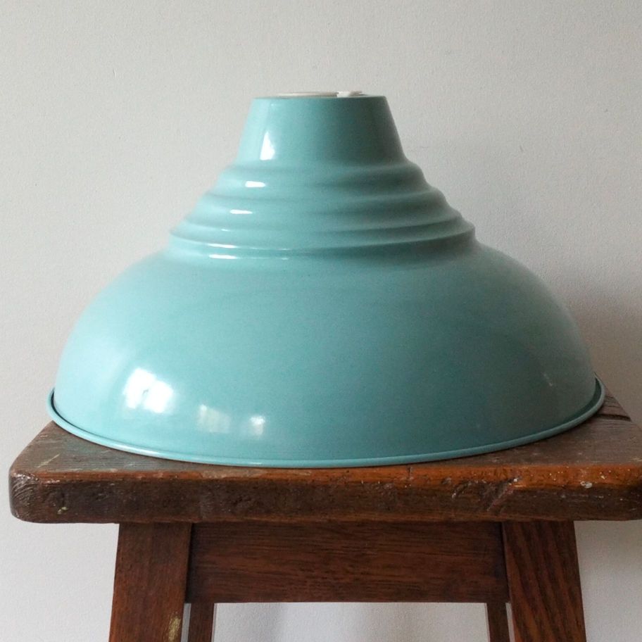 A striking vintage style enamel light shade in a beautiful turquoise or duck egg blue colour, featuring a classic stepped industrial design. Pieces like this were commonly used in factories, workshops, and utilitarian spaces throughout the mid-20th century, where enamel shades were valued for their durability and ability to direct light effectively.