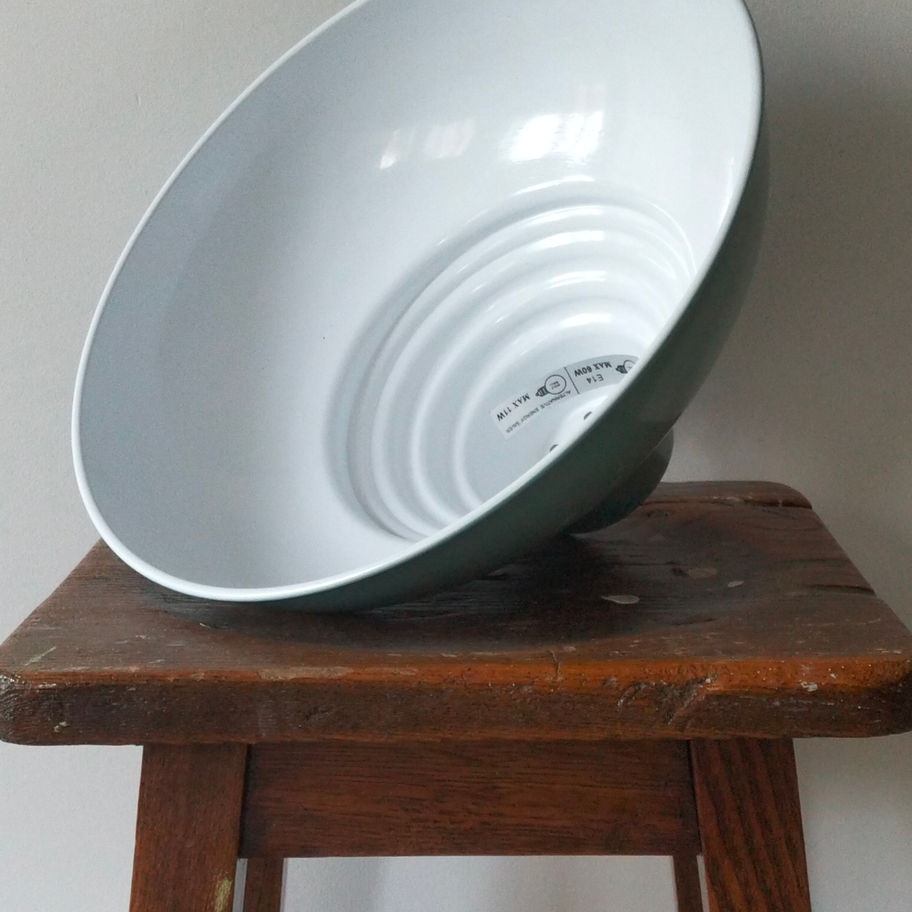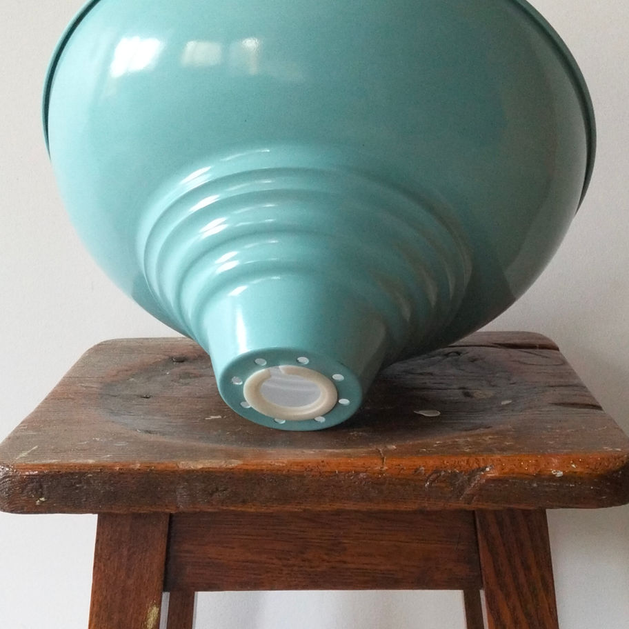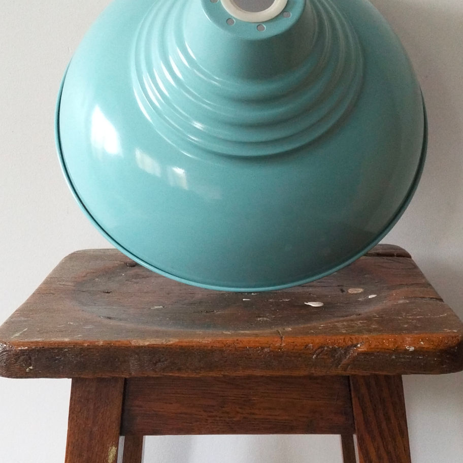 This is a lovely piece – that soft turquoise enamel and stepped industrial style shape are exactly the sort of thing that appeals to people looking for authentic vintage lighting. It has that classic mid- to late 20 th century factory / workshop aesthetic that is very popular in interiors right now.